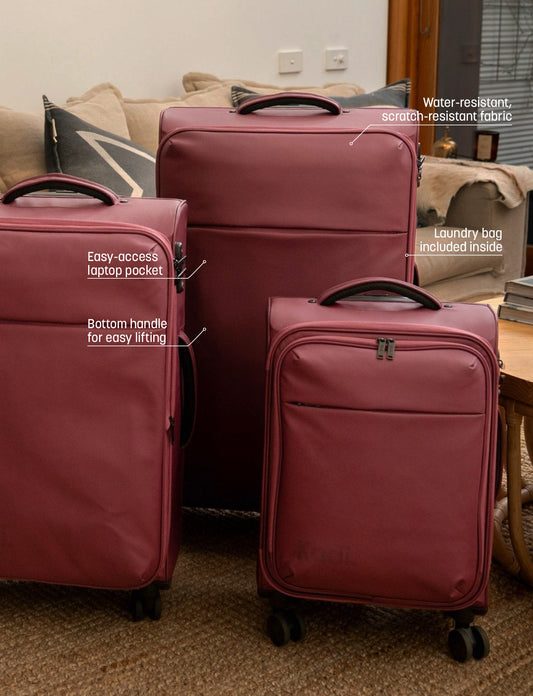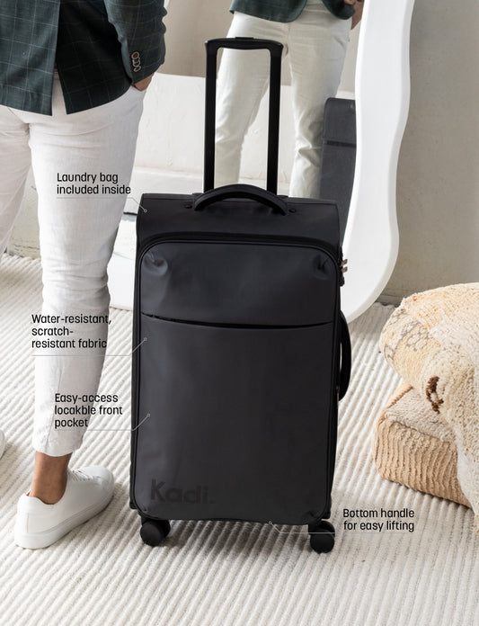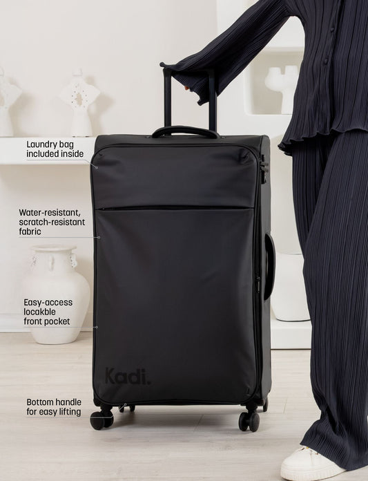 Experience extended escapades with Kadi’s Check-In Large suitcase in Forest Green, designed for the world-touring traveller! Sporting lightweight, soft-edged build, security-enhancing features, and roomy, expandable compartments, our suitcase is perfect for longer ventures. Practical and picturesque, Kadi’s large suitcase accommodates a variety of styles, suitable for both neutral-loving minimalists and vibrancy-craving voyagers!