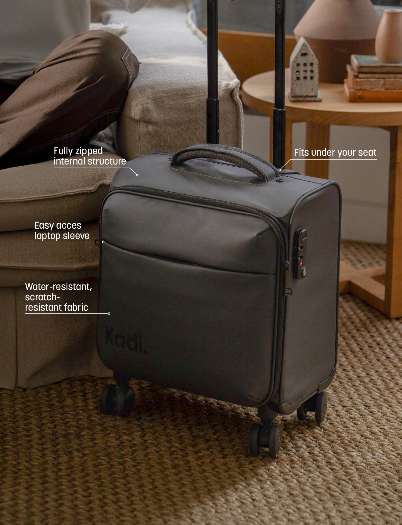 From spontaneous weekend escapes to essential business trips, Kadi’s Cloud Underseater in Charcoal keeps things easy. It slides neatly under most airline seats and gives you fast access to everything that matters mid-flight (laptop, snacks, jumper).