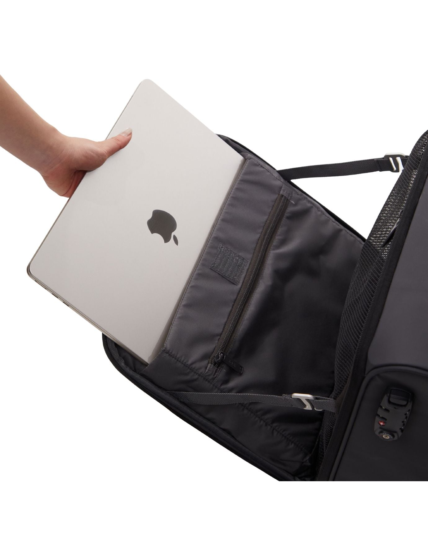 The interior has a padded sleeve to keep your laptop secure, plus a mesh divider to stop your clothes shifting mid-flight. A smaller slip pocket is there for the usual suspects: phone cables, lip balm, spare socks. On the outside, the hidden front pocket locks shut, so the things you reach for most often are always close, but never exposed.